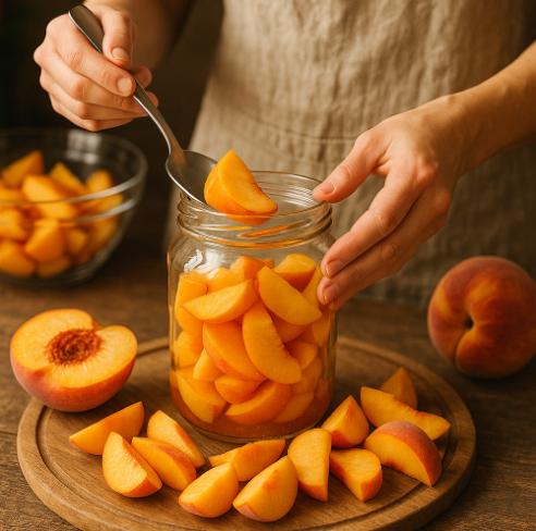 깨끗하게 소독된 유리병에 복숭아와 설탕을 한 겹씩 차곡차곡 번갈아가며 넣어요. 맨 위에는 반드시 설탕으로 덮어주는 게 좋아요. 그래야 공기 접촉을 줄이고, 곰팡이 발생 가능성을 낮출 수 있답니다. 과일을 먼저 넣고 설탕을 마지막에 뿌리는 방식이 가장 안전해요.